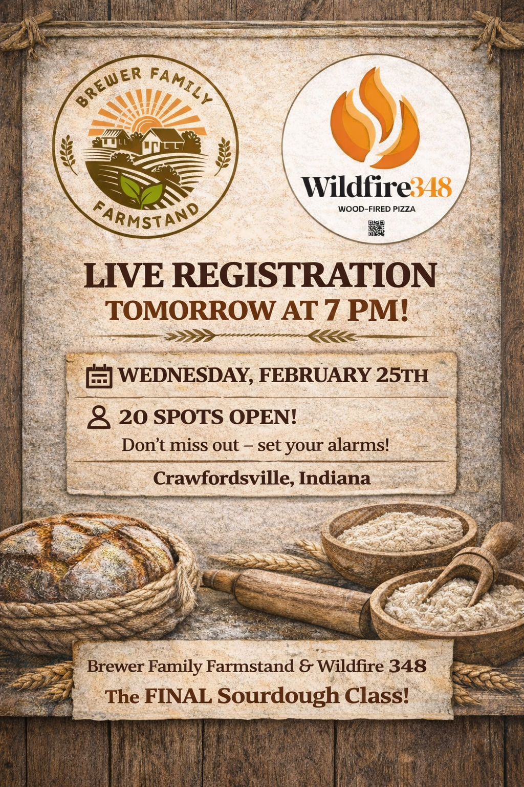 Join us for a hands-on sourdough baking class hosted by Brewer Family Farmstand at Wildfire348 in Crawfordsville, IN.